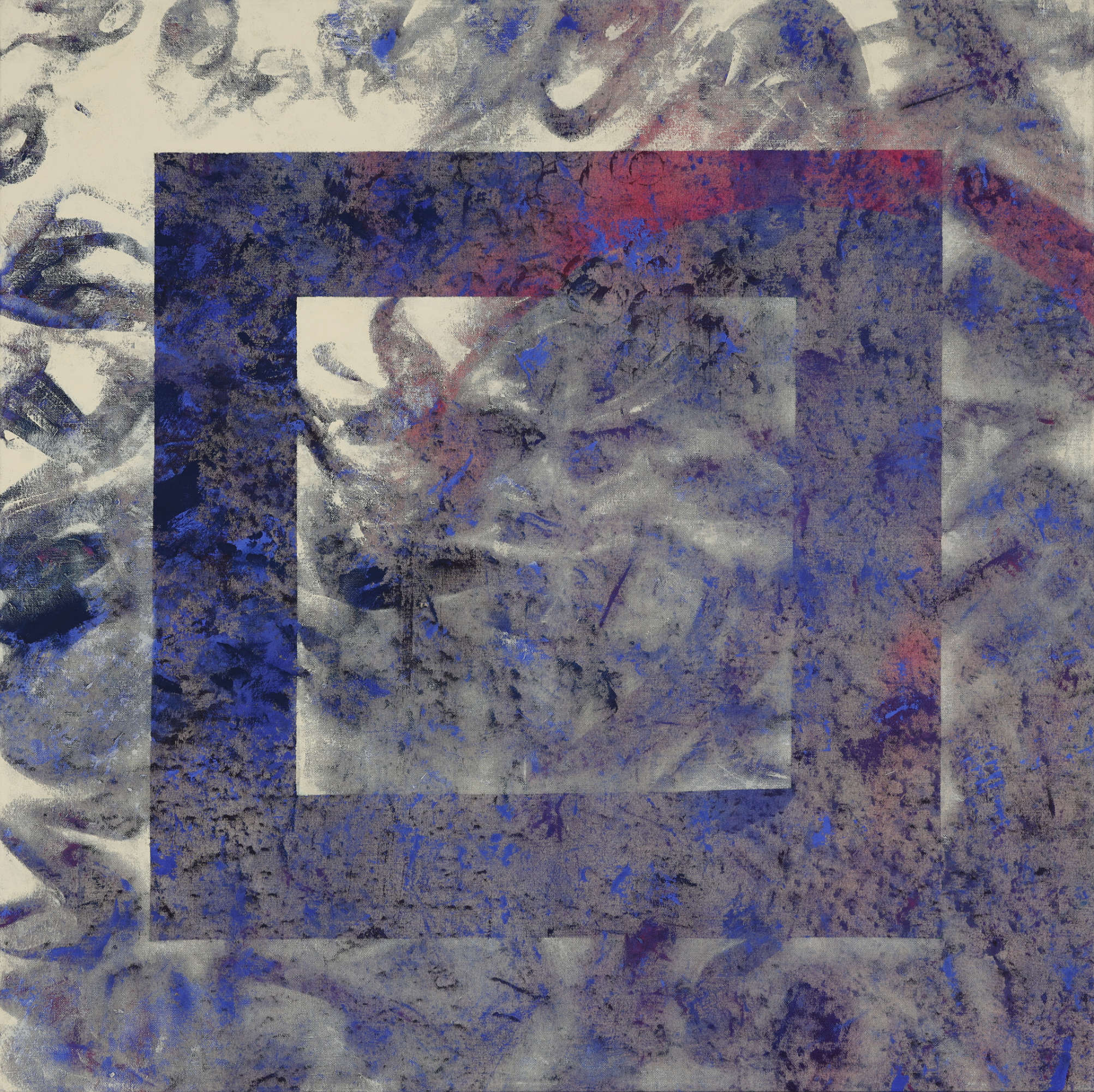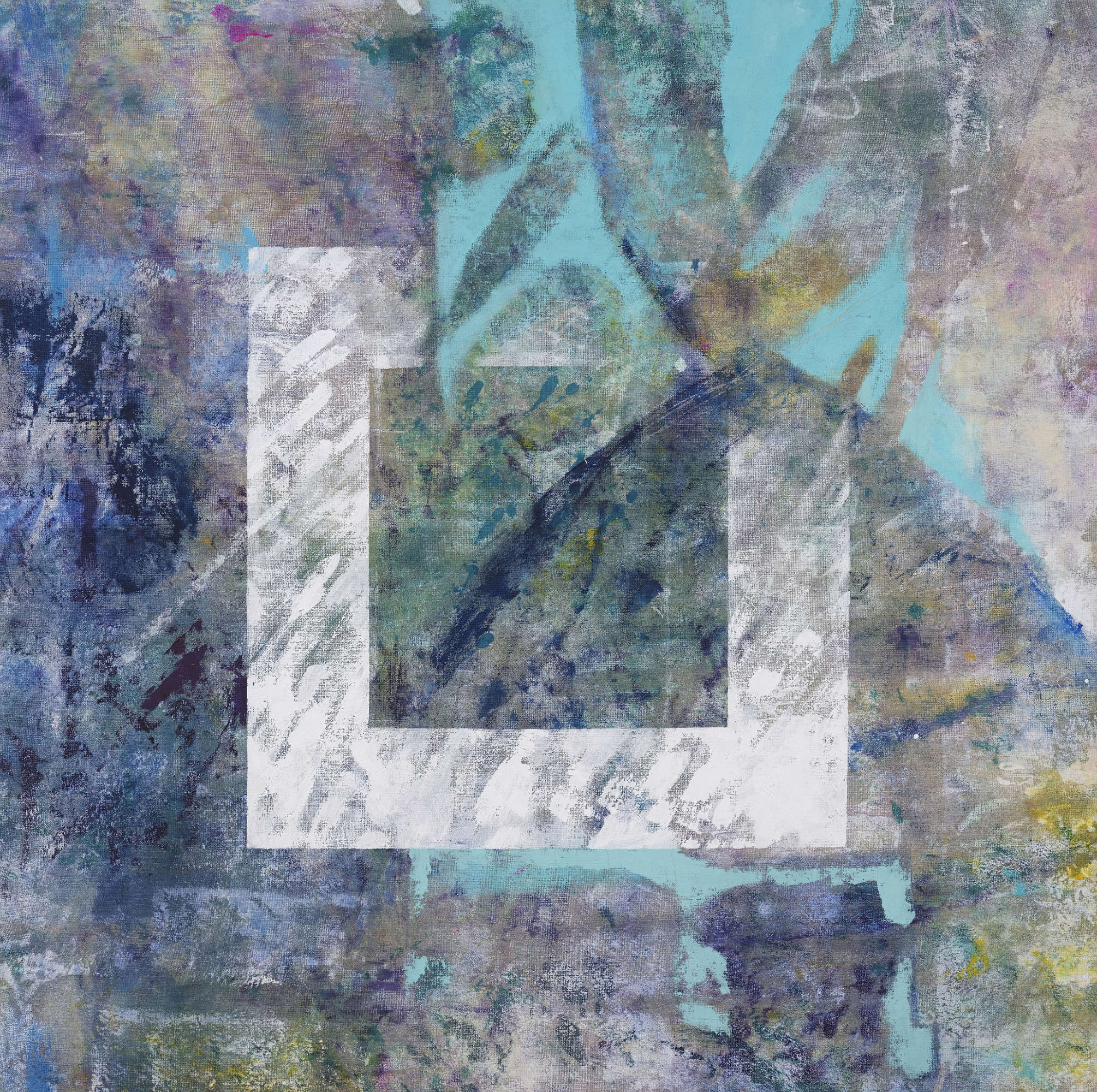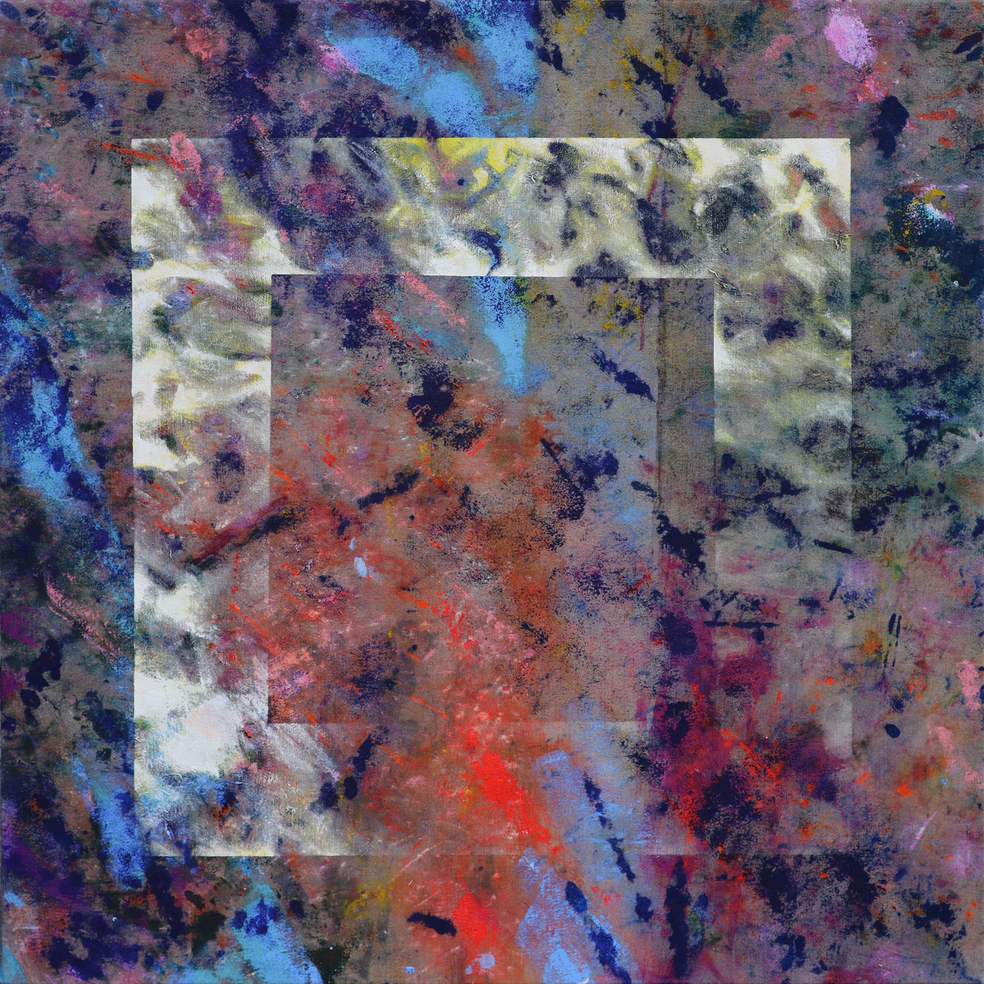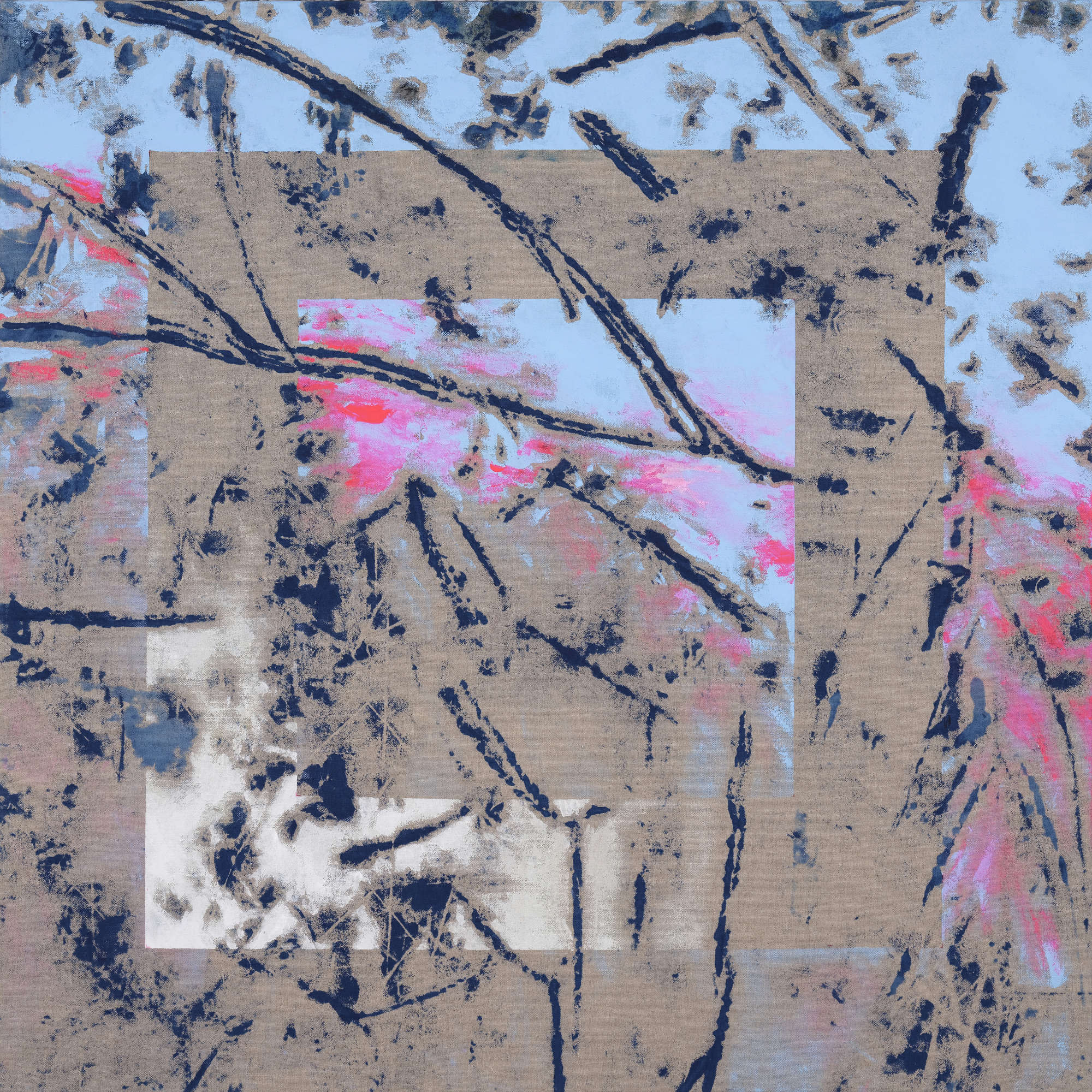 von der Rückseite her. Die auf der Hinterseite der Leinwand aufgetragene Farbe strömt durch den Malgrund auf die Vorderseite und lässt überraschende Ergebnisse entstehen.